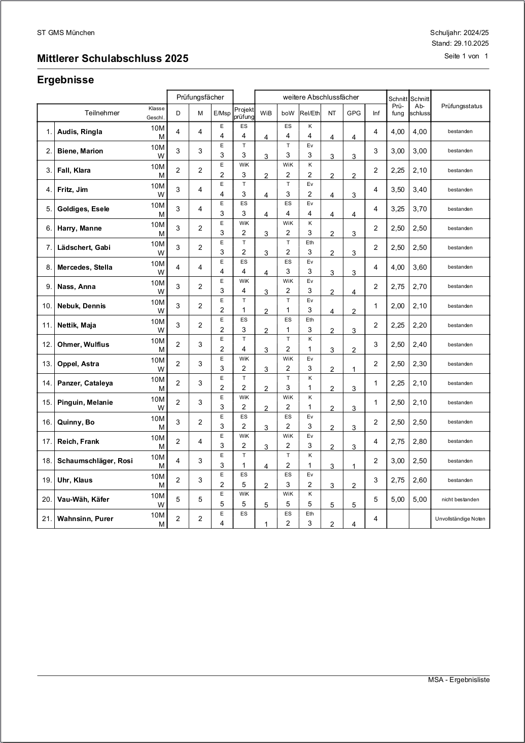 Der Bericht gibt in Listenform die MSA Ergebnisse aus. Die Liste besteht aus Spalten für die Namen der Teilnehmerinnen und Teilnehmer, den Prüfungsfächern, den Notenschnitten und letztendlich dem Prüfungsstatus. Die Liste kann nach dem Namen oder nach dem Rang sortiert werden.