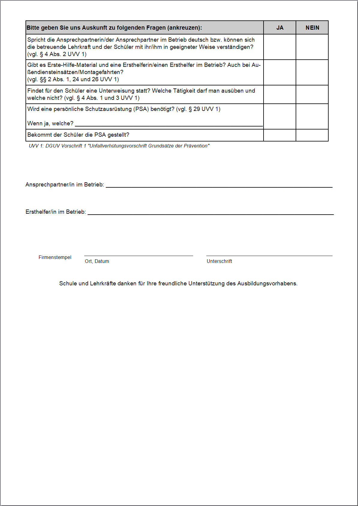 | Kurzbeschreibung: | Personalblatt zum Betriebspraktikum mit Abschnitt für Daten des Praktikumsbetriebs |