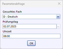 Beim Ausführen des Berichts erscheint ein Dialogfenster. Bei der Parameterabfrage erfolgt die Auswahl des Faches. Ebenso kann der Prüfungstag und die Uhrzeit eingetragen werden.