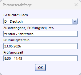 | Kurzbeschreibung: | Alphabetische Gesamtliste der QA-Prüfungsteilnehmerinnen und -teilnehmer je Fach (Dialogabfrage). Auswahl von WiB liefert alle Teilnehmerinnen und Teilnehmer der Projektprüfung; Auswahl von Sport liefert männliche Teilnehmer und weibliche Teilnehmerinnen. |
