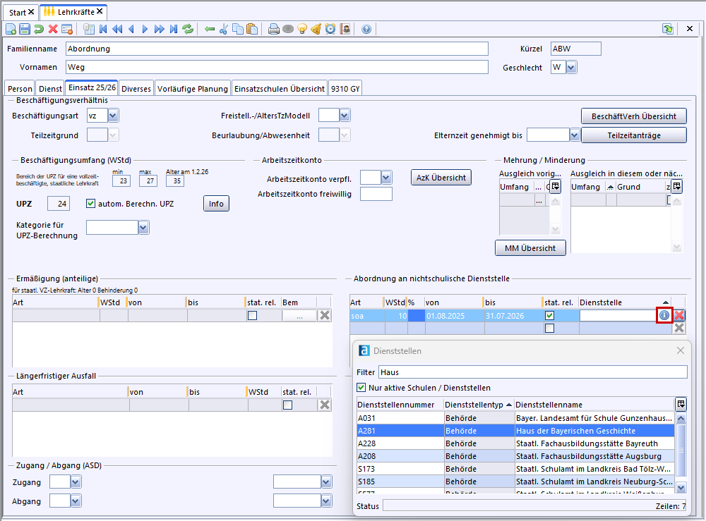 Abordnungen an eine andere Behörde, z.B. das ISB, eine Universität, etc. werden im Reiter Einsatz <SJ> im Bereich Abordnung an nichtschulische Dienststelle eingetragen. Füllen Sie die Felder Art, WStd und den Zeitraum aus.
