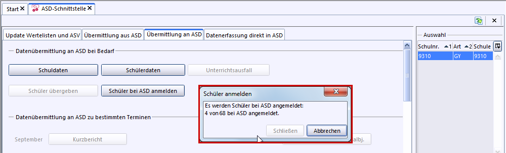 Es erscheint folgendes Meldefenster: Es werden Schüler an ASD angemeldet: X von YY bei ASD angemeldet.