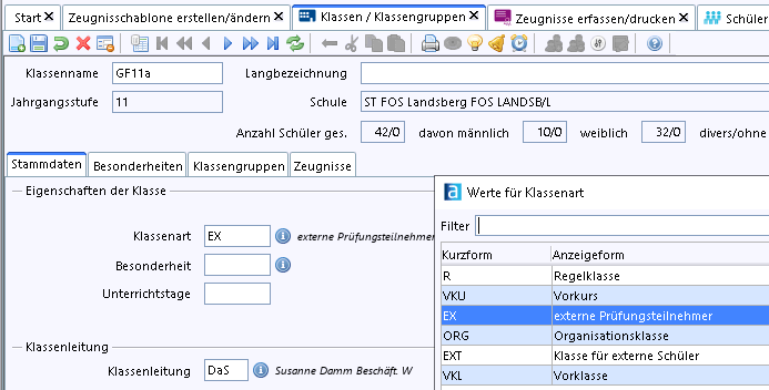 Erfassung als eigene Klasse der Klassenart „EX = externe Prüfungsteilnehmer“
