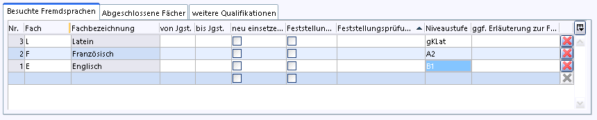 Alle an der FOSBOS angeeigneten Fremdsprachen - keine aus Vorschulen - werden unter Schüler > Laufbahn > Fremdsprachen erfasst (dafür wird auch die Niveaustufe berechnet und diese am Zeugnis ausgewiesen)