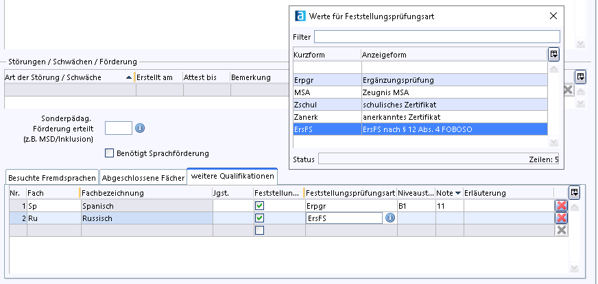 Erfassung der Ergänzungsprüfung für die 2. Fremdsprache (da nur hier eine Note erfasst werden kann) - Feststellungsprüfungsart „Erpgr“
