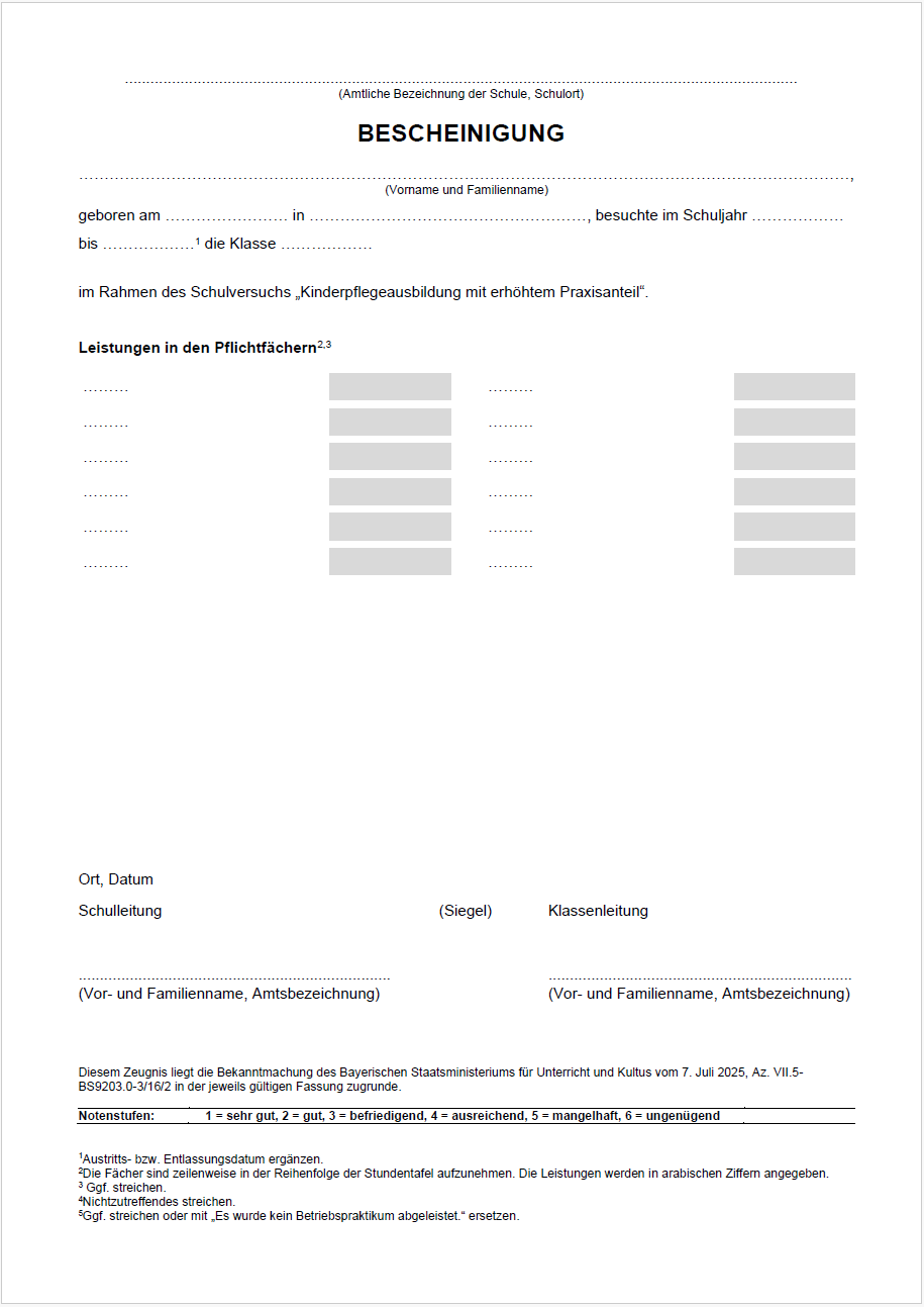Bescheinigung für den Schulversuch KiPrax für Berufsfachschulen Kinderpflege.