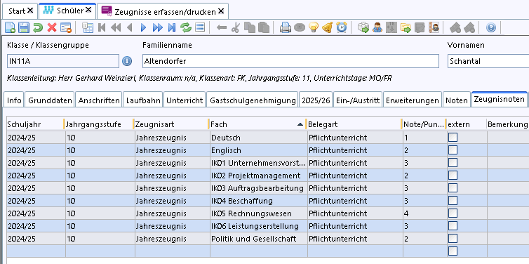 Die Vorjahresnoten für das Abschlusszeugnis können, wie bisher, manuell erfasst werden.