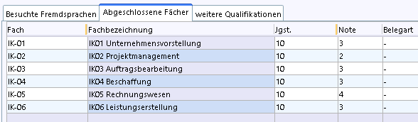 Für Lernfelder ohne Bündelungsfächer sind die Noten aus der 10. und 11. Klasse in das Abschlusszeugnis zu übernehmen. Dies erfolgt technisch über abgeschlossene Fächer in der Schüler > Laufbahn > Reiter abgeschlossene Pflichtfächer.