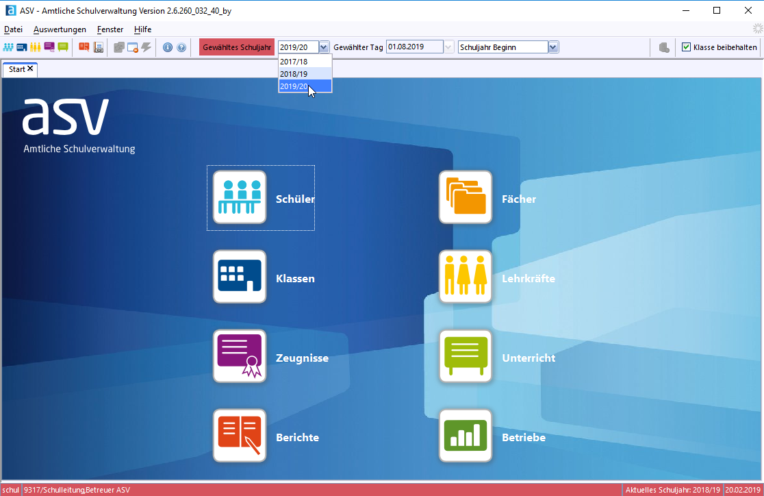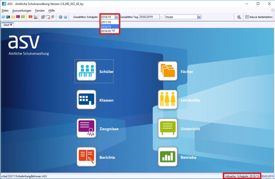 In ASV hat man Zugriff auf drei Schuljahre, zwischen welchen man in einer laufenden Sitzung beliebig wechseln kann: