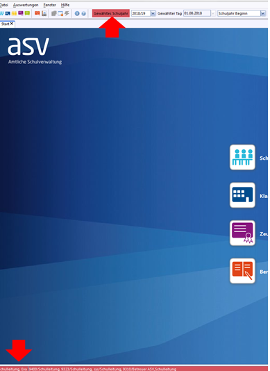 Stellen Sie ASV auf das Planungsschuljahr um. Klicken Sie auf die Auswahl Gewähltes Schuljahr in der Symbolleiste und wählen Sie mit der Drop-Down-Liste das Planungsschuljahr aus. Sie erkennen dieses Schuljahr an der roten Statuszeile des Programmfensters von ASV