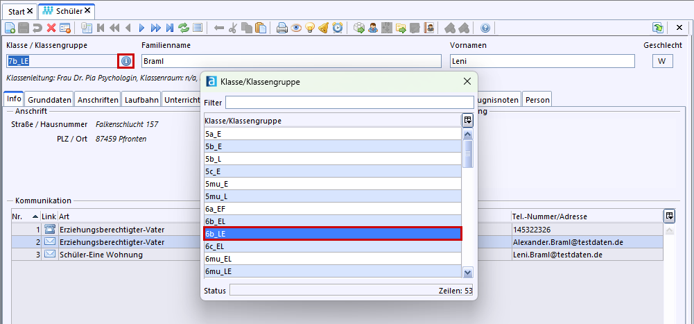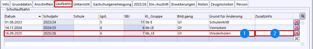 In der Schullaufbahn muss der Grund für das Wiederholen im Feld Zusatzinfo allerdings manuell nachgepflegt werden (2)!