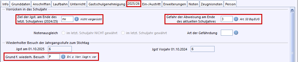 2. Ergänzen Sie bei Wiederholern auf dem Schuljahresreiter 20xx/yy die entsprechenden Einträge