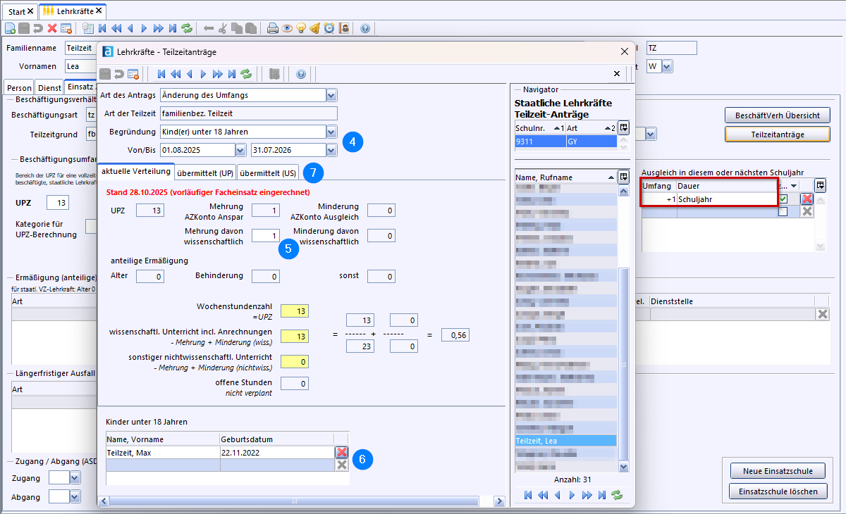 Sollte eine Lehrkraft mit zur UP übermittelten Teilzeitantrag nun doch nicht in Teilzeit arbeiten (Elternzeit, Vollzeit, längerfristiger Ausfall), so muss der ursprüngliche Antrag mit der Konsistenzprüfung 2.1 gelöscht werden!