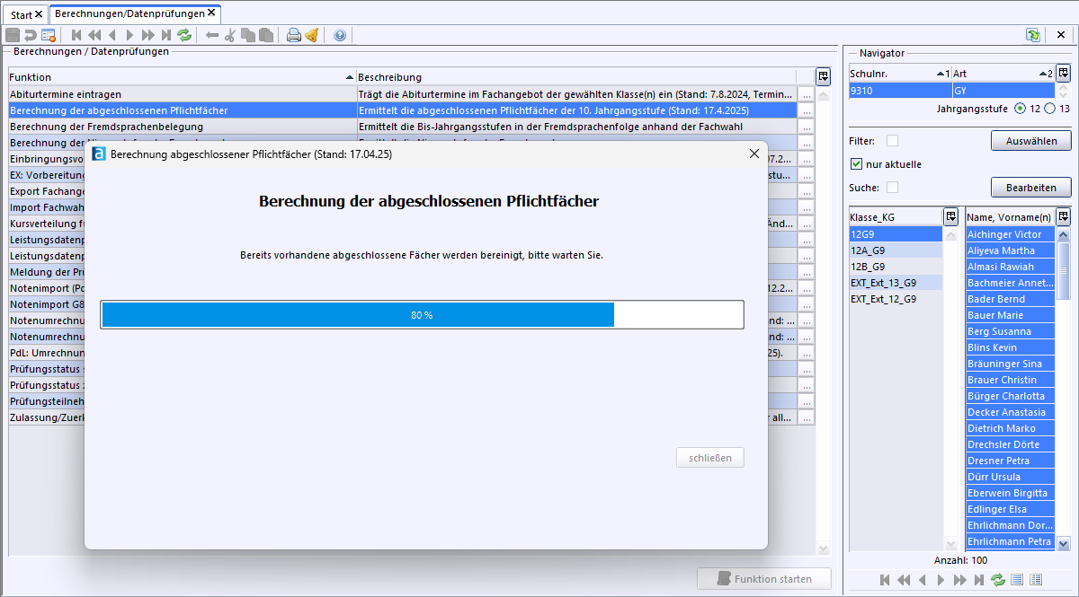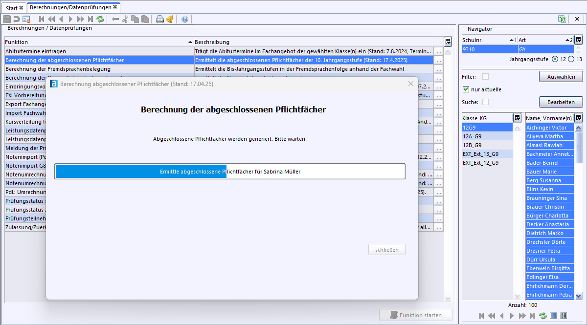 Anschließend werden die abgeschlossenen Pflichtfächer neu berechnet. Wie weit die Generierung bereits umgesetzt ist, wird über einen Fortschrittsbalken dargestellt, in dem der Name der Schülerin bzw. des Schülers ausgegeben wird, die/der aktuell in Bearbeitung ist.