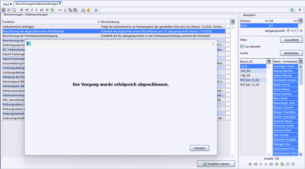 6. Sollten noch keine Eintragungen zu den abgeschlossenen Pflichtfächern bei den ausgewählten Schülerinnen und Schülern vorliegen, startet die Berechnung automatisch.