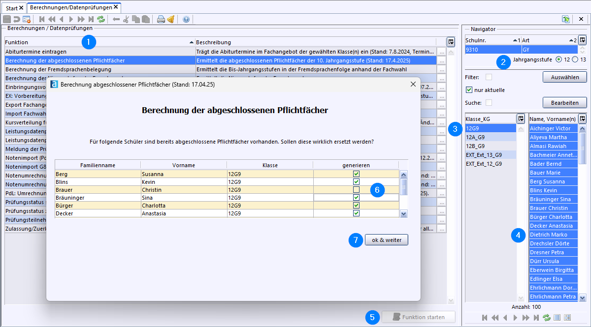 Wechseln Sie über Datei > Oberstufe > Berechnungen/Datenprüfungen in das Oberstufenmodul.