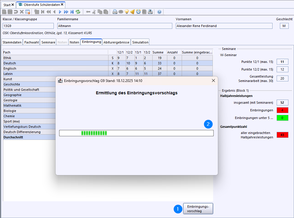 Über den Button Einbringungsvorschlag wird die Einbringung für die einzelne Schülerin bzw. den einzelnen Schüler bestimmt.