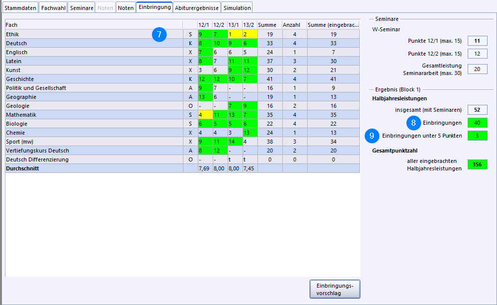 Im Modul Berichte steht im Datenbereich Schüler der Bericht Einbringung zur Verfügung, in dem die Leistungen aus den Kurshalbjahren und den Seminaren tabellarisch dargestellt und die eingebrachten markiert sind.