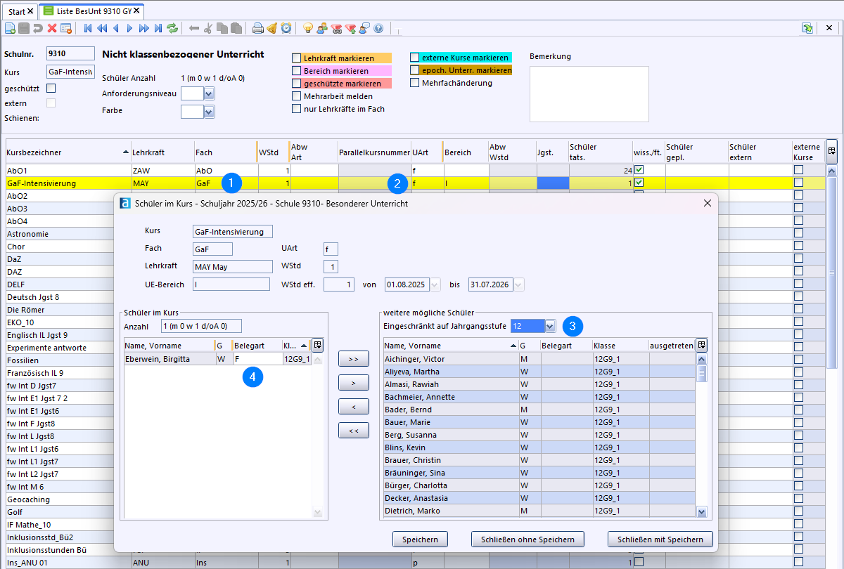 3. Über Schüler im Kurs kann auf die Jahrgangsstufe gefiltert werden.