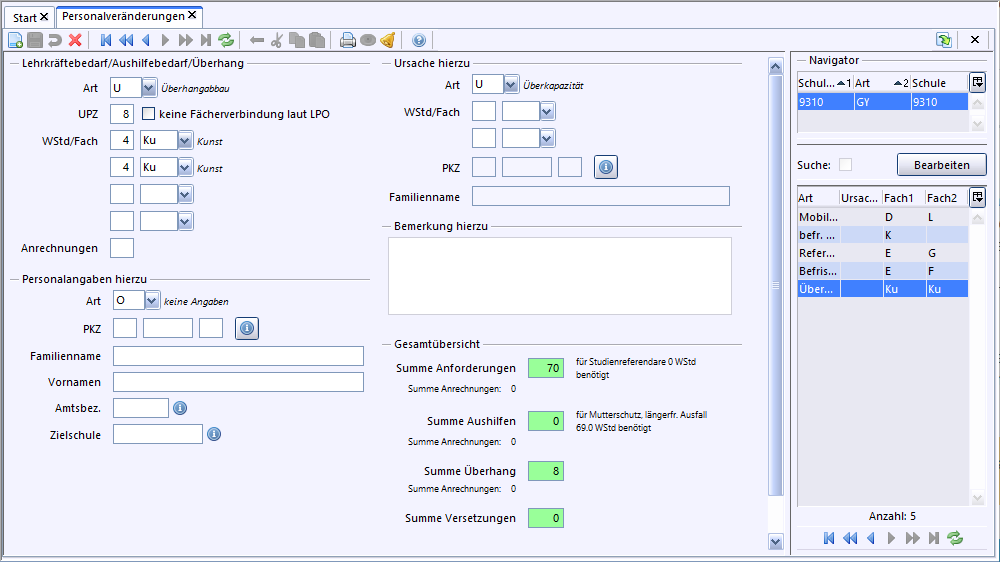 Besteht ein Überhang, wird eine Anforderung der Art U mit Ursache U erfasst. Vom Ministerium wird eine aufnehmende Nachbarschule für den fächerspezifischen Überhang gesucht, die abzuordnende Lehrkraft wird von der Schule ausgewählt.