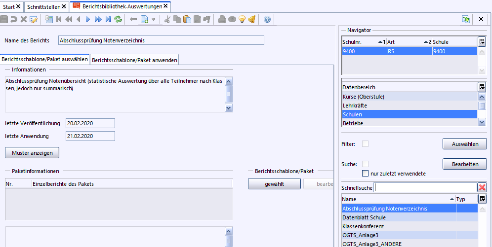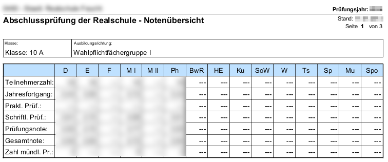 In der Berichtsbibliothek steht im Datenbereich Schüler der Bericht „Abschlussprüfung RS Bekanntgabe der Ergebnisse“ zur Verfügung, welcher genutzt werden kann, um die Ergebnisse der schriftlichen Prüfung bekannt zu geben.